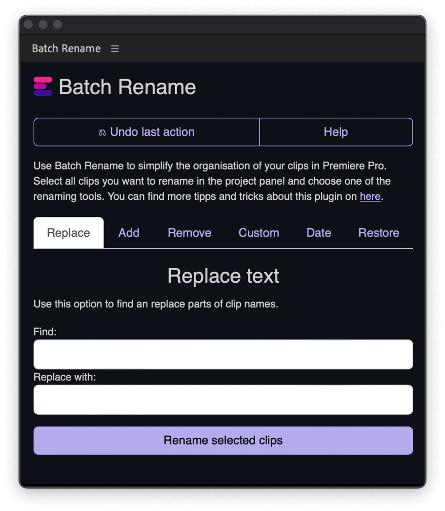The Batch Rename plugin enables you new possibilities to simplify the organization of your clips in Premiere Pro. Select your clips and use the plugin to batch rename your clips faster. Replace words in your source files or add dates and custom text to your clip names. The plugin offers more options to optimize big Premiere Pro productions. Optimized for the needs of assistant editors.