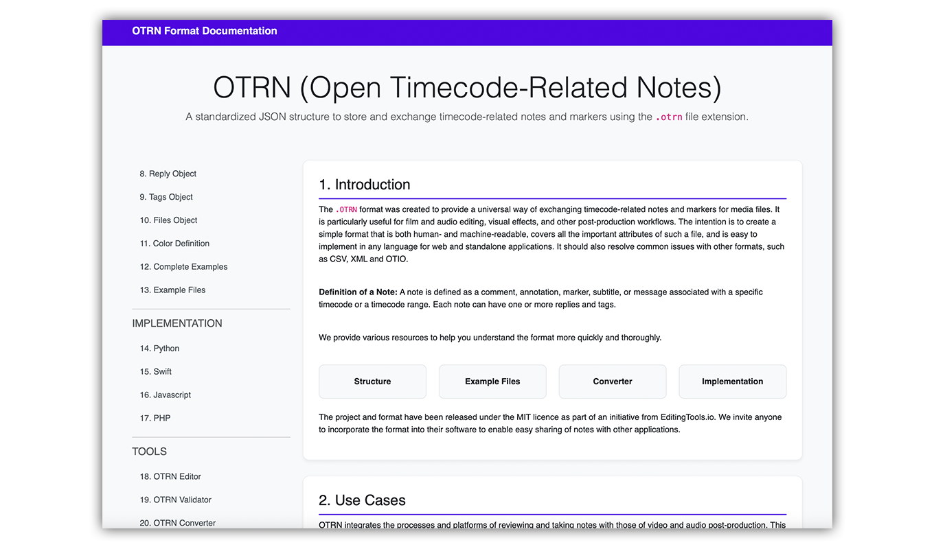The .OTRN format was created to provide a universal way of exchanging timecode-related notes and markers for media files. It is particularly useful for film and audio editing, visual effects, and other post-production workflows. The intention is to create a simple format that is both human- and machine-readable, covers all the important attributes of such a file, and is easy to implement in any language for web and standalone applications. It should also resolve common issues with other formats, such as CSV, XML and OTIO.